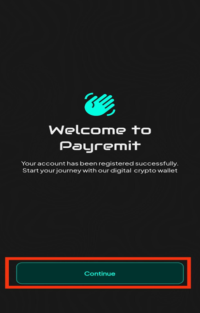 If you have entered the correct verification code, you will automatically be redirected to a congratulatory page for the success of your account registration. Click on continue to proceed to your dashboard.