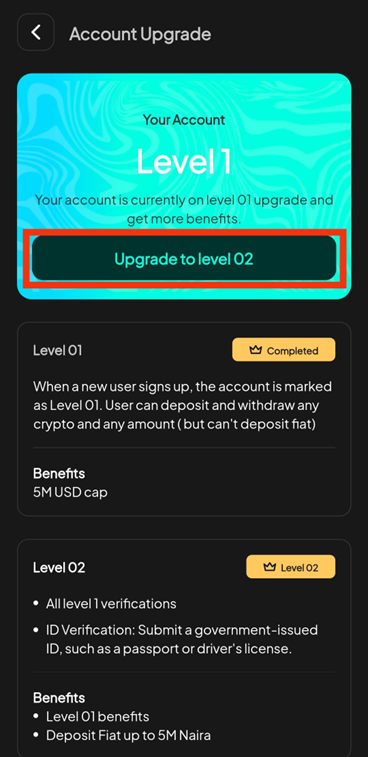 Level 1 (Default Level): Benefits: Swap Limit: Users can swap up to $5M of cryptocurrencies. Level 2: Benefits: Swap Limit: Everything in Level 1 + users can swap up to $5M worth of cryptocurrencies. Deposit Limit: Users can deposit up to 5M Nigerian ...